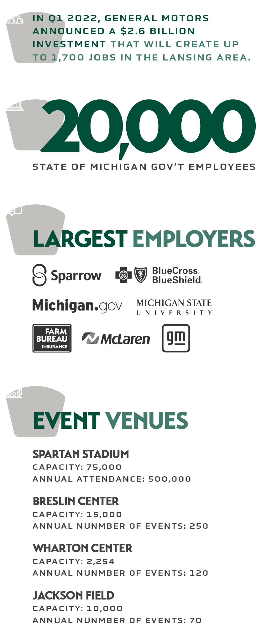 Lansing is home to General Motor’s Lansing-Delta Assembly plant, one of the most advanced manufacturing plants in the world, and to the headquarters of some of Michigan’s largest insurance providers, including Farm Bureau and Auto Owners.  The city has also enjoyed impressive retail center growth in recent years.